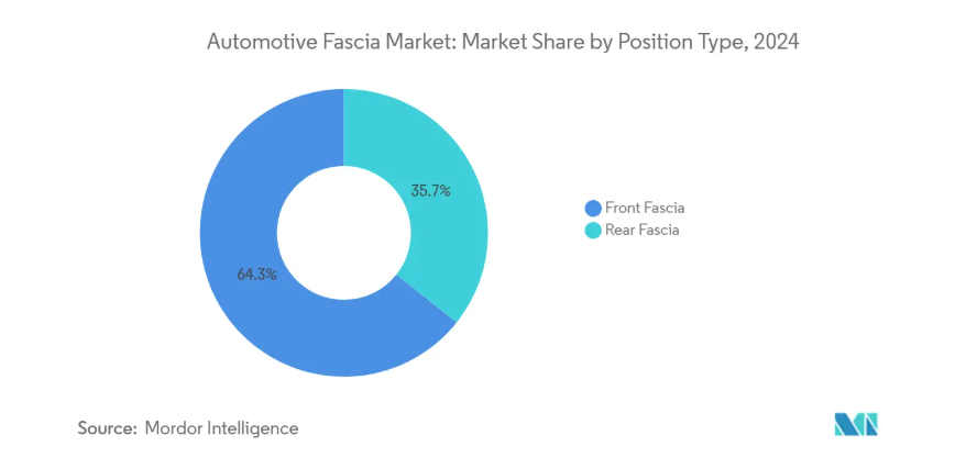 フロントフェイシアアセンブリは2024年に自動車用フェイシア市場の64.27%を占め、空気抵抗低減と歩行者保護における中核的役割を浮き彫りにしました。このセグメントは、前面面積を拡大せずに高精細カメラ、長距離レーダー、洗浄ノズルを搭載する必要性から、6.83%のCAGRで成長すると予測されています。設計サイクルの進化に伴い、ウォッシャー液通路や加熱素子はバンパービーム内に直接配置され、寒冷地におけるセンサー稼働時間の確保が図られています。リアフェイシアシステムは収益面で後塵を拝していますが、自動駐車ソフトウェアを支援するスマート照明アレイや駐車レーダーの搭載に向けた進化も進んでいます。