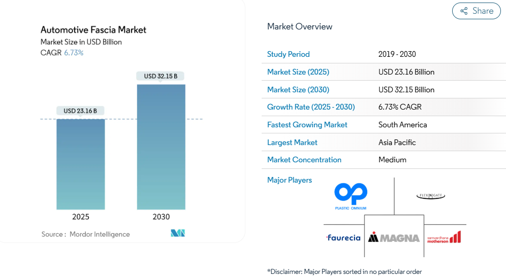 競争の激しさは中程度であり、上位5社のサプライヤーが世界のフロントパネル収益の約3分の2を占めるため、センサー透過性やバイオ素材に特化したニッチ専門企業に参入余地が残されています。プラスチック・オムニウム社は水素タンクと燃料電池の統合に3億ユーロを投じており、同社がゼロエミッション商用車のフロントパネル組立の中核となる可能性があります。マグナ社はNVIDIA社と協力し、レベル2+からレベル4のアクティブセーフティスタックを開発中です。同社の電子ビームグリルシャッターとサラウンドビューフロントグリルトリムは、無線ソフトウェア更新機能[3]のハードウェア基盤として位置付けられています。フォルビア社は、シートと照明のポートフォリオを活用し、カラーマッチングされたポリカーボネート製バンパースキンの背面にフルワイドライトバーを販売しています。これにより、スタイルと通信機能を1つの購入注文に統合しています。