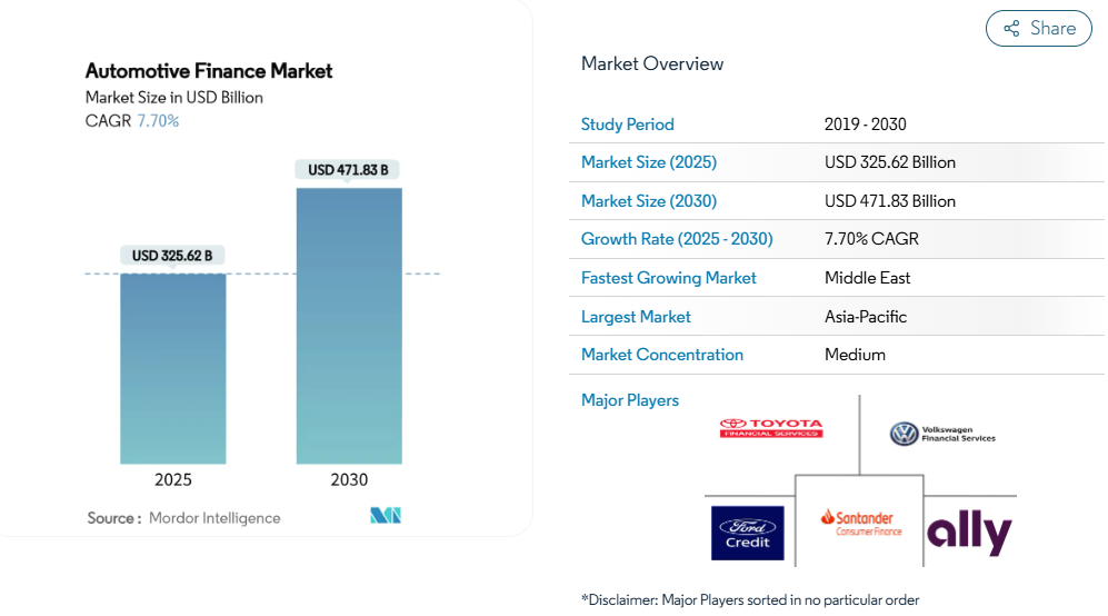 自動車金融市場は、2025年時点で3,256億2,000万米ドルの規模であり、2030年までに4,718億3,000万米ドルに達すると予測されています。これは2025年から2030年にかけて年平均成長率(CAGR)7.7%という健全な成長率を示しています。中古車ローンは既に自動車金融市場の53.40%を占めており、9.2%という急速なペースで成長を続けており、2030年まで主要な成長エンジンであり続ける見込みです。