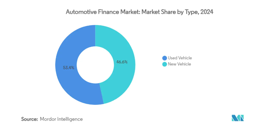 自動車金融市場における中古車セグメントは、2024年に市場全体の53.40%を占め、9.2%の年平均成長率(CAGR)が市場全体の成長率を上回るため、その優位性をさらに拡大し続ける見込みです。認定中古車プログラムにより保証範囲が主流化され、貸し手はほぼ新車同等の車両を優良リスク担保として扱うことが可能となりました。デジタルマーケットプレイスは規模をさらに拡大させています。主要ポータルサイトに統合されたローンウィジェットにより、申込から承認までの転換率が30%以上向上しています。その結果、中古車セグメントの自動車金融市場規模は2030年までに2,800億米ドルを超えると予測されています。