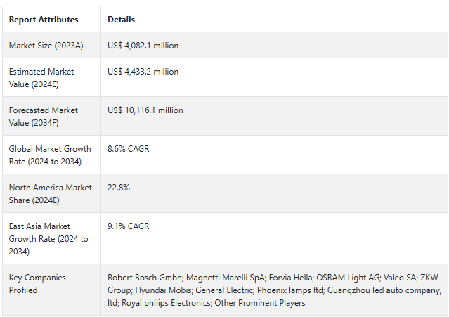 LEDフォグランプの需要は、2024年から2034年にかけて年平均成長率10.6%で増加し、絶対額で24億7,730万米ドルの機会を生み出すと予測されています。