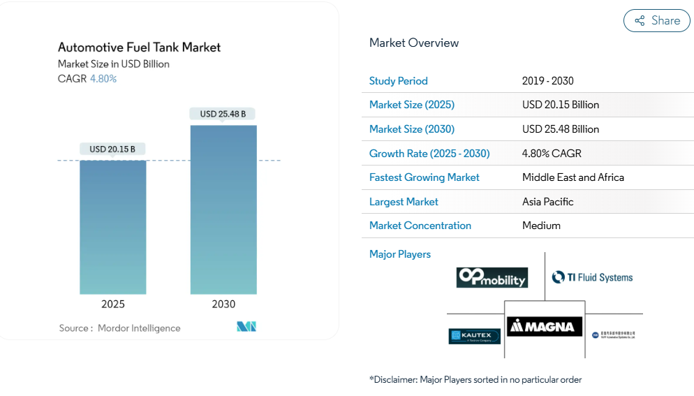 自動車用燃料タンク市場は中程度の集中度を示しています。プラスチック・オムニウム、TIフルイドシステムズ、マグナ・インターナショナルは、グローバルな事業基盤、自社設計能力、長年にわたるOEM実績を活かし、量産プログラムをカバーしています。プラスチック・オムニウムが2030年までに30億ユーロの水素関連収益目標を掲げていることは、高圧複合材分野への戦略的転換を象徴しています。TIフルイドシステムズは2024年に電動化関連受注で21億ユーロを記録しましたが、従来型タンクからの収益を最大限活用し、熱管理分野の拡大に充てています。マグナは鋼材、プラスチック、バッテリー筐体技術を統合し、内燃機関車、ハイブリッド車、BEVを融合するOEMプラットフォームの収束に対応しています。