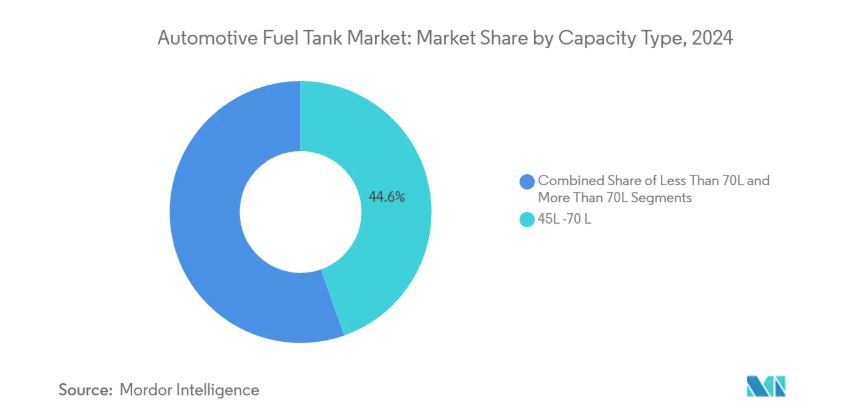 45~70リットル帯は2024年に44.59%のシェアで市場を支配しました。これは自動車燃料タンク市場の核となる、世界中のBセグメントおよびCセグメント乗用車のほとんどに適合するサイズです。OEMプラットフォームのサイクルにより、このサイズ帯が予測期間の深部まで固定されているため、安定した需要が持続しています。しかしながら、70リットル超のタンクは年平均成長率11.53%で拡大し、2030年までにこのクラスの自動車用燃料タンク市場規模を押し上げます。成長要因は、長距離トラック、大型SUV、高搭載エネルギーを必要とする水素プロトタイプ車両にあります。軍用車両は作戦行動範囲を拡大し前線地域における兵站リスクを軽減するため、100リットルを超える補助燃料タンクを調達しています。複合材オーバーラップシリンダーは従来金属タンクより15~20%軽量化され、水素利用時の容積損失を部分的に相殺しています。自動繊維配置技術を習得したサプライヤーは、従来のフィラメントワインディングよりも迅速に生産規模を拡大でき、コスト優位性を維持。70リットル超カテゴリーでのシェア拡大を後押ししています。