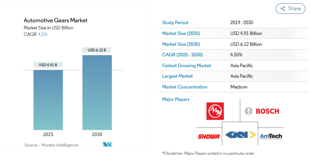 自動車用ギア市場の主要メーカーには、American Axle & Manufacturing Holdings Inc.、AmTech International、Bharat Gears Ltd、GKN PLC、Robert Bosch GmbH、Gleason Plastic Gears、Showa Corporation、Universal Auto Gears LLPなどが挙げられます。