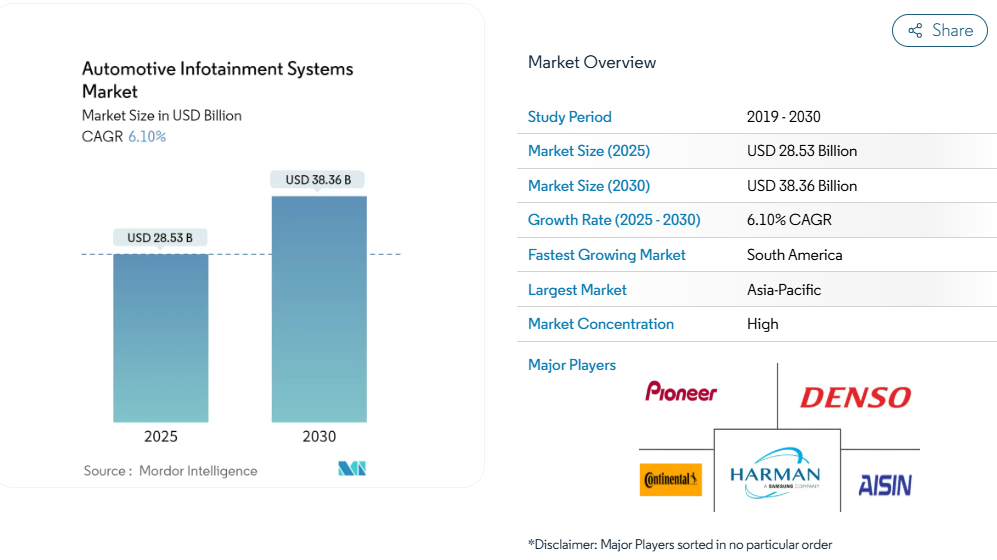 世界の自動車用インフォテインメントシステム市場は、2025年に285億3,000万米ドルに達し、2030年までに383億6,000万米ドルに拡大すると予測されています。予測期間中の年平均成長率(CAGR)は6.10%となる見込みです。この成長軌跡は、自動車産業がソフトウェア定義車両へと根本的に移行していることを反映しており、インフォテインメントシステムは、ドライバーとますます複雑化する車両アーキテクチャとの主要なインターフェースとして機能します。