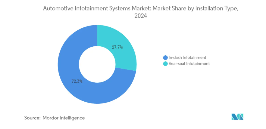 2024年の出荷台数においてダッシュボード内蔵型が72.32%を占め、自動車インフォテインメントシステム市場におけるその支配的地位を示しています。BMWが間もなく導入予定のパノラミックiDriveは、48インチ曲面OLEDと3Dヘッドアップオーバーレイを融合させ、独立したボタンなしでHVAC(冷暖房)、ナビゲーション、エンターテインメントを中央ディスプレイが統合制御する新たな形を提示しています。テスラのモデルYコックピットは、物理的なノブをソフトウェアメニューで置き換えたハードウェア最小限主義の好例です。一方、後席エンターテインメント分野は、自動運転機能が乗客の運転操作から解放されることで、年平均成長率11.81%の成長が見込まれています。高級ブランドでは、天井取り付け型マルチディスプレイやシートバックアレイによる4Kコンテンツ配信を展開し、サブスクリプション収益の固定プラットフォームを構築しています。ハーマンの「SeatSonic」はシートフレームを通じて音響を伝達し、車内の騒音レベルを上げずに没入感を高めます。ライドシェアリング車両の増加も需要を後押ししており、通勤中のビデオオンデマンド利用を求める乗客が増加したため、中級セダンでもエンターテインメント画面の追加設置が進んでいます。