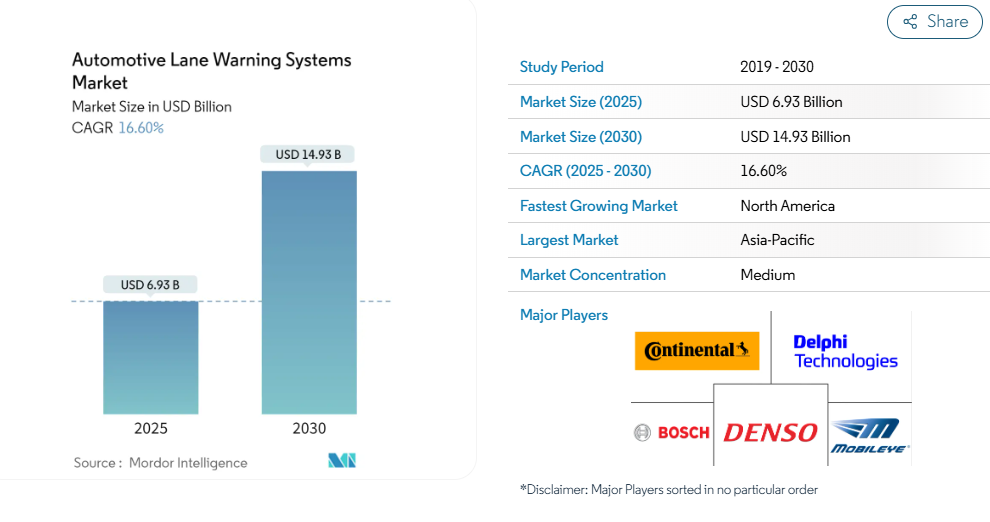 世界の自動車用車線逸脱警報システム市場:車線逸脱警報システム、車線維持支援システム(2025年~2030年)