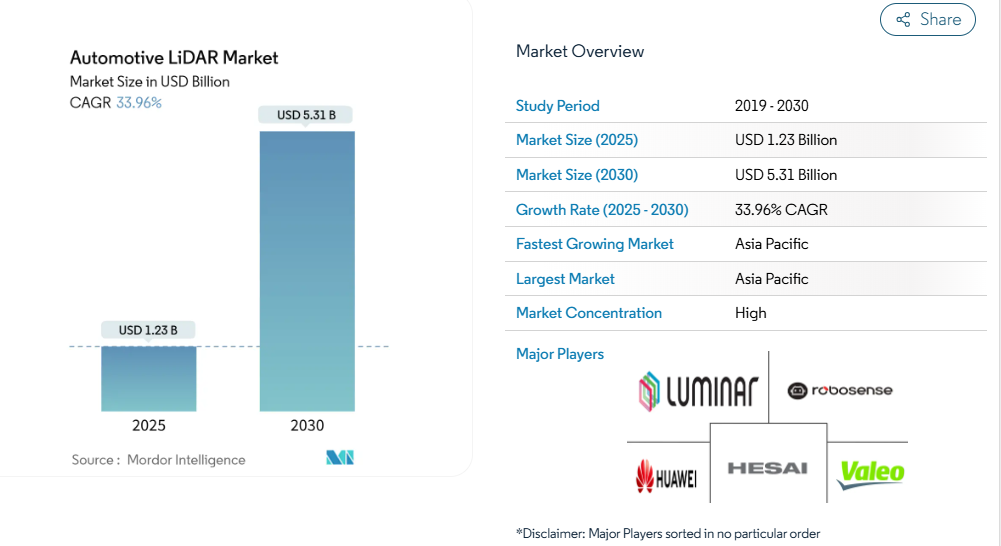 Hesai が自動車用 LiDAR 市場をリードし、Huawei HI-XG と RoboSense がそれに続いています。Valeo は Scala シリーズでニッチ市場を維持し、Luminar はヨーロッパのプレミアム契約で大きなシェアを占めています。