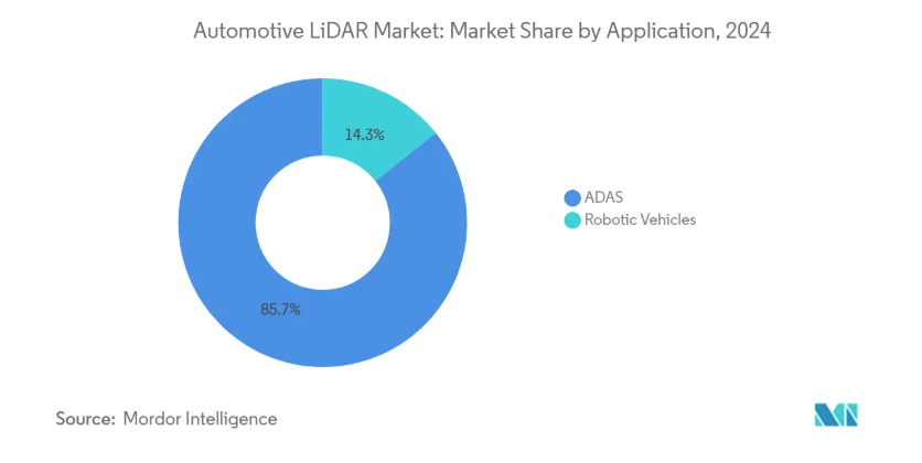2024年、ADAS(先進運転支援システム)は自動車用LiDAR市場の85.71%を占め、主流化が進んでいることを示しています。さらにADASは都市レベルでの認可やライドシェアリング車両の受注を背景に、39.14%のCAGR(年平均成長率)で最も急速に成長しているセグメントです。ADASレベル3およびレベル4プログラムが橋渡し役:ドイツの高級車メーカーは既に量産レベルのレベル3高速道路パイロットシステムを出荷しており、中国のモビリティ企業は10以上の大都市圏で監視付きレベル4サービスを運営しています。より高い自動運転レベルには複数のセンサー、冗長性、フルスタック検証が必要であり、車両あたりの平均搭載量を増やし、自動車用LiDAR市場規模拡大の次の波を牽引します。