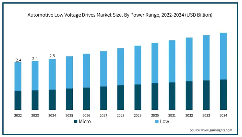 自動車用低電圧ドライブ業界は、高度な自動車製造施設への投資拡大と自動化機能の向上を背景に成長が見込まれています。当局はエネルギー消費と排出量の削減を目的とした低炭素技術に注力しており、これが業界の見通しにポジティブな影響を与えるでしょう。例えば、2024年5月、大気中の二酸化炭素排出量に関する懸念から、欧州連合(EU)は厳格な規制を承認しました。この規制では、2040年までに大型トラックとバスの排出量を90%削減し、2030年までに大型車両の排出量を45%、2035年までに65%削減する目標が設定されています。EUはまた、2027年にこれらのガイドラインを見直す規定を導入し、その効果を監視する予定です。