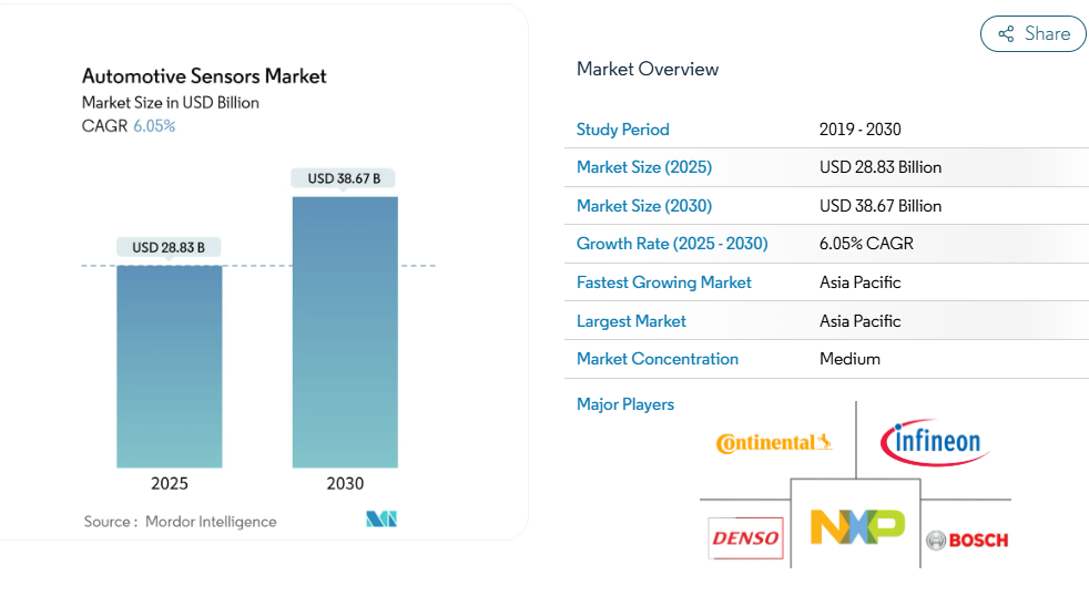 ロバート・ボッシュ、デンソー、コンチネンタルといった主要市場プレイヤーは、信号処理機能や接続機能をセンサーパッケージ内に直接組み込むことで、拡大する価値を獲得しています。従来のティア1サプライヤーは、垂直統合、独自ソフトウェアスタック、OEMとの共同設計センターで対応しています。新興の中国企業は、競争力のある価格設定でセンサーとソフトウェアの統合ソリューションを提供し、コスト競争を激化させています。