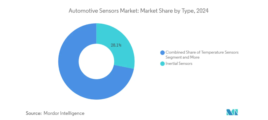 2024年の売上高の28.13%を慣性センサーが占めました。加速度計とジャイロスコープが電子式安定性制御(ESC)、ナビゲーション、ADASスタックの中核を担っているためです。高解像度慣性計測装置(IMU)はゾーンアーキテクチャ内に組み込まれ、サプライヤーはAEC-Q100グレード1準拠の自己診断機能を統合し、配線削減とシステム全体の軽量化を図っています。磁気センサーはEV駆動モーター制御で採用が拡大し、ガスセンサーは排出ガス規制と車内空気品質基準により需要が回復しています。圧力・温度センサーは内燃機関を超え、バッテリーの熱暴走検知分野へ進出中です。