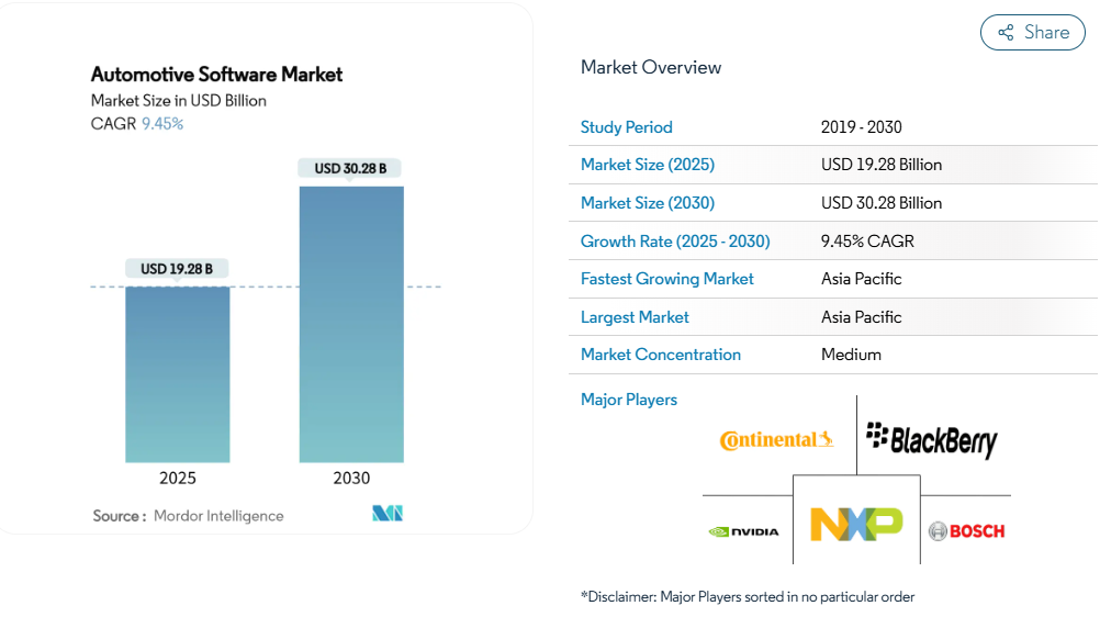世界の自動車用ソフトウェア市場:アプリケーションソフトウェア、ミドルウェア、その他(2025年~2030年)
