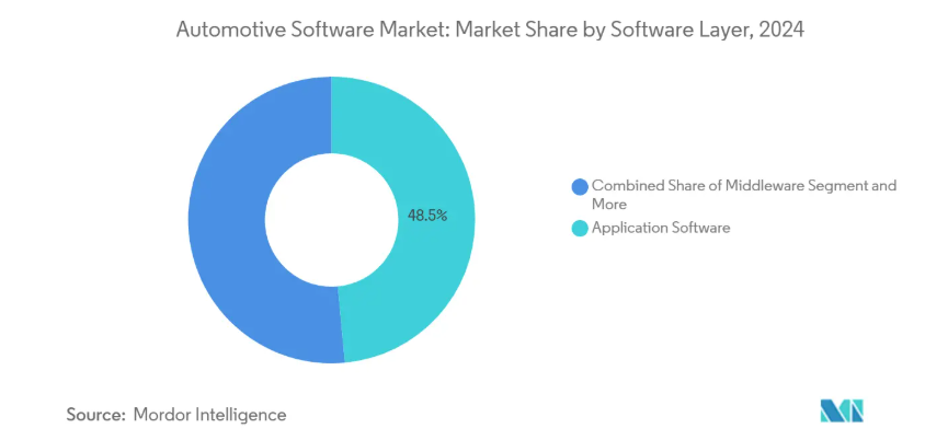 アプリケーションソフトウェアは2024年においても自動車ソフトウェア市場の48.53%を占め、最高収益源を維持しています。これはADAS、インフォテインメント、パーソナライズされた無線アップデート(OTA)に対する顧客の需要を反映しています。オペレーティングシステムプラットフォームは最も急速に成長する分野であり、OEMが機能安全向けに強化されたLinuxベースのディストリビューションを採用する中、年平均成長率(CAGR)9.71%で拡大しています。統合コンピューティングによる機能展開の迅速化に伴い、アプリケーション層コードの市場規模は着実に拡大すると予測されます。POSIXカーネルと高レベルアプリケーション間の安全認証済みブリッジとして機能するミドルウェアの戦略的価値も同様に高まっており、Aptiv社はこれをゾーン間トラフィックの「オーケストレーター」と呼んでいます。