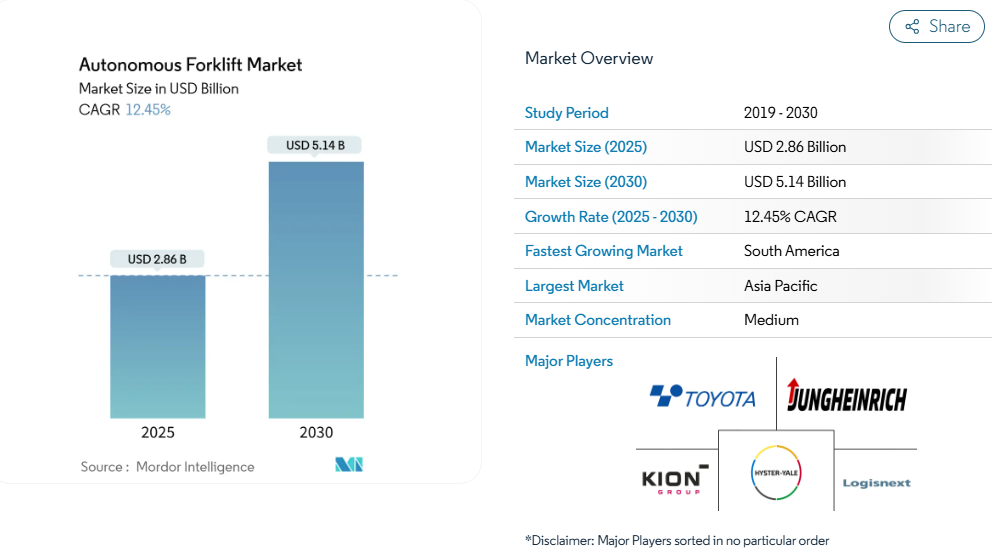 自律走行フォークリフト市場は2025年に28億6,000万米ドルに達し、2030年までに年平均成長率12.45%で拡大し、51億4,000万米ドルに達すると予測されています。この堅調な成長は、労働力不足の深刻化、電子商取引の急速な需要拡大、ならびにナビゲーション・センシング・フリート協調ソフトウェアの着実な進歩を反映しています。企業が脱炭素化の取り組みを推進する中、電気パワートレインが出荷台数を占めております。