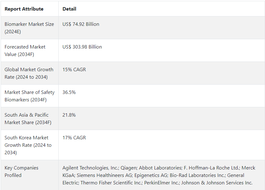バイオマーカーの販売による収益は、2024年には749億2000万ドルに達する見込みであることが、Fact.MRが発行した最新市場レポートで明らかになりました。 世界のバイオマーカー市場規模は、2桁のCAGR15%で拡大し、2034年末までに3039.8億ドルに達すると概算されています。