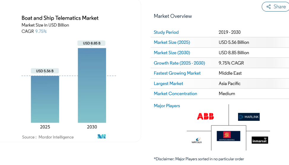 船舶テレマティクス市場は2025年に55億6,000万米ドルに達し、2030年までに88億5,000万米ドルに成長すると予測されています。これは予測期間(2025-2030年)における年平均成長率(CAGR)9.75%を示しています。成長は、義務化された長距離識別規則、拡大する低軌道衛星ネットワーク、および燃料消費と排出量の削減に役立つリアルタイムの船隊可視性に対する需要の高まりによって推進されています。