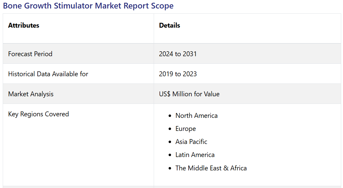 Bone Growth Stimulator Market by Product (Bone growth stimulation devices, Bone Morphogenetic Proteins (BMP), Platelet-Rich Plasma (PRP)), Application (Spinal fusion surgeries, Delayed union & nonunion bone fractures, Orthopedic trauma surgeries, and Others), and Region for 2024 to 2031