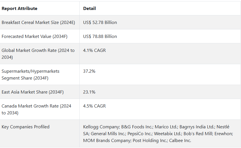 Fact.MRが新たに発行したレポートで明らかにしたように、朝食用シリアルの販売による世界的な収益は、2024年には527.8億米ドルに達すると推定されている。 世界の朝食用シリアル市場は年平均成長率4.1%で拡大し、2034年末までに788.8億米ドルに達すると予測されている。