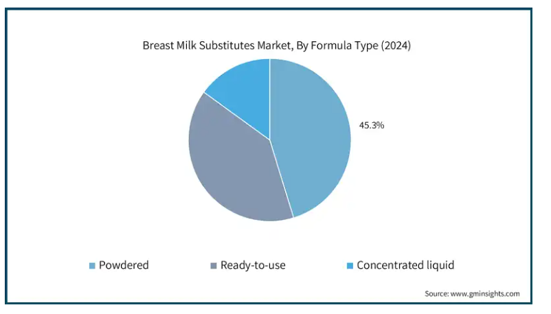 粉ミルクの種類別では、母乳代用品市場は粉末タイプ、濃縮液体タイプ、すぐに使えるタイプに区分されます。2024年の売上高が最も大きいのは粉末タイプで395億米ドル。
