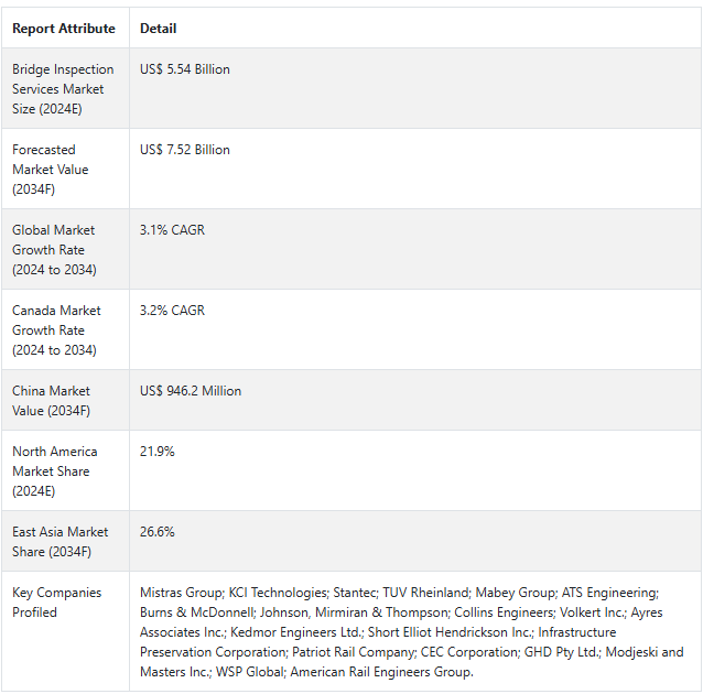 橋梁点検サービス市場の世界的展望(2024年~2034年)検査別、検査目的別、橋カテゴリー別、試験別、橋構造別、地域別の動向分析&予測