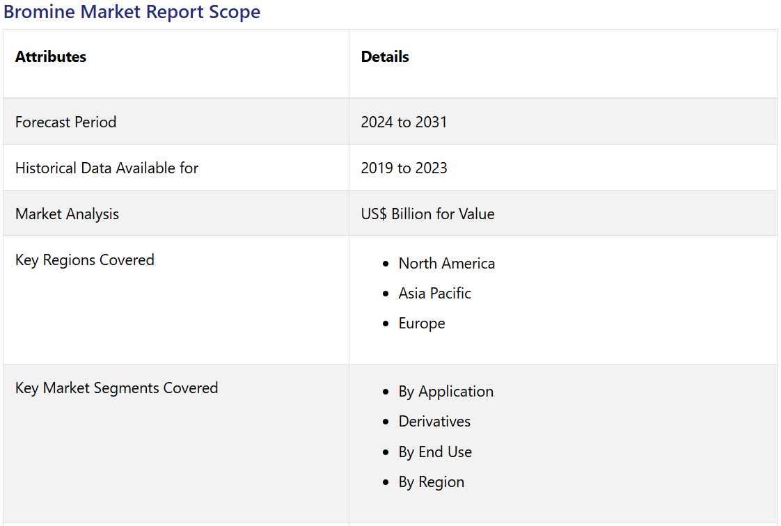 Bromine Market by Application (Biocide, Flame Retardant, Oil and Gas Drilling, and Plasma Etching,), Derivatives (Organobromides, Clear Brine Fluid, and Hydrogen Bromide), End Use (Oil & Gas, Chemicals, Pharmaceuticals and Cosmetics, Medical, Agricultural and Pesticides, Automotive, and Building and Construction,), and Region for 2024 – 2031