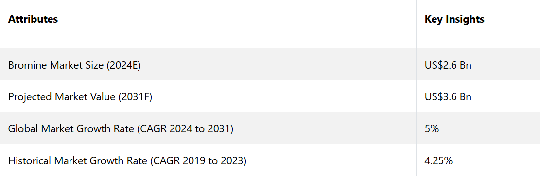 市場は上昇傾向を維持し、2031年には市場規模が36億米ドルに達するとの予測も出ています。この成長は、いくつかの主要な臭素市場の動向に牽引された需要の加速を反映し、2024年から2031年にかけて年平均成長率(CAGR)5%で成長すると予測されています。