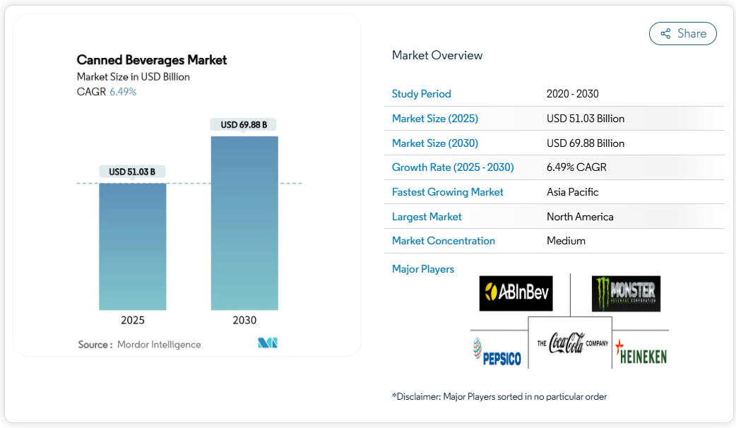 缶飲料市場は中程度の集中度を示しており、確立された多国籍企業と、ニッチなポジショニングや現地市場知識を活用する新興地域プレイヤーとの間で均衡のとれた競争が展開されています。戦略的な統合が競争環境を再構築しており、その一例として、カールスバーグによるブリトビックの42億米ドルでの買収(2025年1月)が挙げられます。この買収はビールと清涼飲料のポートフォリオ間で相乗効果を生み出すと同時に、ペプシコなどの主要パートナーとの関係強化につながっています。ABインベブ、ザ・コカ・コーラ・カンパニー、ペプシコ、ハイネケンN.V.、モンスター・エナジー・カンパニーなどの主要企業は、缶飲料市場で大きなシェアを占めています。これらの確立されたブランドは、低カロリー飲料、機能性飲料、より持続可能な包装オプションなど、製品ラインの拡大を通じて、変化する消費者の嗜好に継続的に適応しています。
