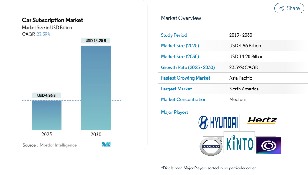 車両サブスクリプション市場の規模は、2025年に49億6,000万米ドルに達し、2030年までに142億米ドルに達すると予測されています。この期間における年平均成長率(CAGR)は23.39%で拡大する見込みです。消費者が所有からアクセスベースのモビリティへ移行するにつれ需要が加速しており、この傾向はOEMが継続的な収益確保に努めることや、政府が走行距離に応じた道路使用料の試験導入を進めることでさらに強まっています。