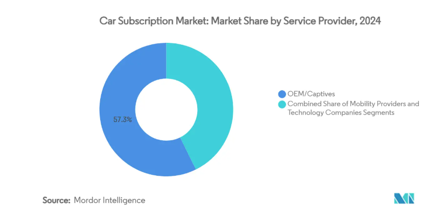 OEM/直営サービスは2024年に57.35%の市場シェアを占めますが、モビリティプロバイダーは2030年まで年平均成長率28.65%という最も強い成長軌道を示しており、既存の自動車メーカーと技術主導のディスラプター間の競争的緊張関係を反映しています。メルセデス・ベンツ・モビリティがデジタル変革イニシアチブにサブスクリプションサービスを統合した事例は、OEMが既存顧客関係とブランド価値を活用してサブスクリプション普及を推進する手法を体現しています。テクノロジー企業は規模こそ小さいものの戦略的に重要な位置を占め、サブスクリプションエコシステム構築を支えるプラットフォーム基盤整備とデータ分析能力に注力しています。