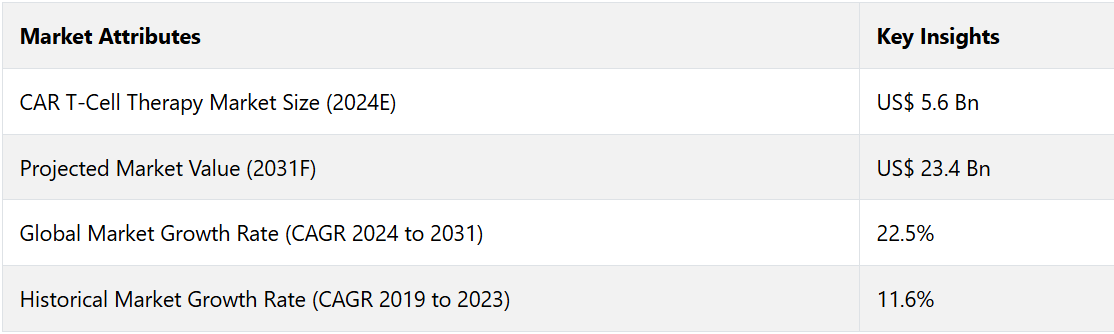 CAR T細胞療法市場は、2019年から2023年の期間に著しく成長しました。がん治療におけるCAR T細胞療法の使用増加は、依然として市場成長の主な要因となっています。