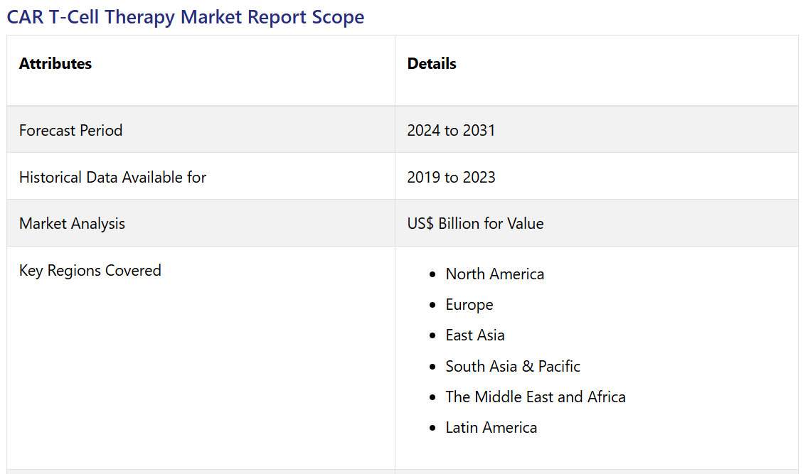 肺がん、大腸がん、多発性骨髄腫、前立腺がんなどの癌治療の研究開発への注目が高まっています。この傾向は、CAR T細胞療法の提供者にいくつかの成長機会をもたらすことが予想されます。戦略的買収も、メーカーが市場のより大きなシェア獲得に向けた取り組みを加速するのに役立つ可能性があります。
