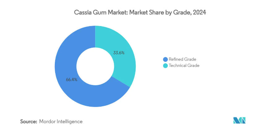精製グレードセグメントは2024年に66.43%の市場シェアを占め、2030年まで年平均成長率(CAGR)9.32%という最速の成長が見込まれております。これは、一貫した品質と最小限の不純物を要求する医薬品およびプレミアム食品用途に牽引されたものです。このセグメントの市場支配力は、産業が高付加価値用途へ大きくシフトしていることを反映しています。特に高度な薬物送達システムでは、添加剤の品質が治療効果や患者転帰に直接影響するため、厳格な純度仕様がプレミアム価格設定を正当化します。一方、工業用食品加工や飼料製造といったコスト重視用途では、機能性能や加工特性が純度要件を上回るため、テクニカルグレードのカシアガムが主に使用されます。ただし、規制強化が進む中、精製グレードと比較して成長可能性は大幅に制限されています。