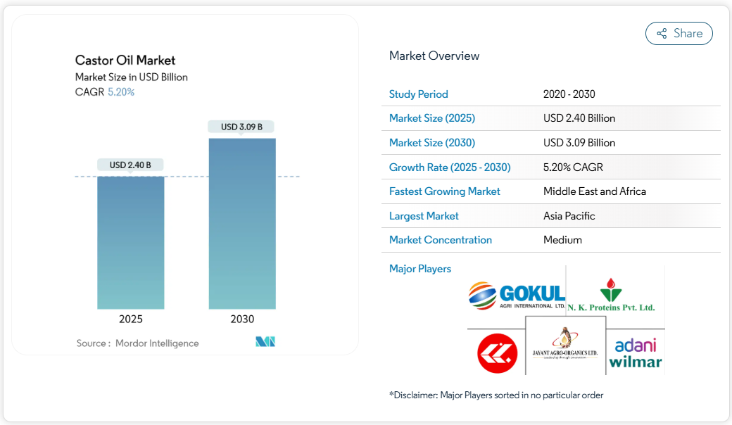 技術も競争上の優位性の一つです:カストロールのON e-thermal fluid(ヒマシ油エステル配合)は、バッテリー充電速度を41%向上させる基準を確立し、配合技術を持たない企業の参入障壁を高めています。高性能ポリアミドメーカーは長期供給契約によりセバシン酸の供給を確保し、スポット買い手向けの原料入手難を深刻化させています。こうした状況下、ヒマシ油市場では種子・油・派生製品の加工を統合管理する垂直統合戦略が優位性を発揮する一方、新規参入企業はニッチな高付加価値用途でシェアを獲得しています。