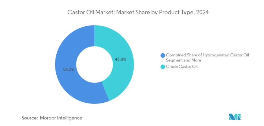 粗ヒマシ油は2024年にヒマシ油市場シェアの44.27%を占め、下流化学品や潤滑油の基幹原料としての重要性を示しています。ポリウレタンや可塑剤メーカーからの安定した需要により、大量抽出プラントはほぼフル稼働を維持し、規模の経済効果によって利益率の安定が守られています。水素化グレードは、食品接触用ポリマーにおけるニッチ需要(21 CFR 178.3280規制下)を有し、塩化ビニルポリマーへの重量比4%までの使用が許可されています。脱水グレードは保護コーティング剤の速乾性樹脂として機能し、新興の航空燃料経路ではイソパラフィン生産向け水素化粗油の評価が進んでいます。