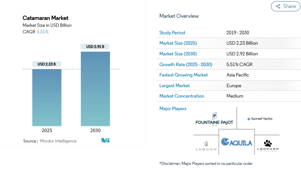 カタマラン市場は中程度の分散状態にあります。欧州の造船所は伝統的な設計ノウハウを活かし、密集したサプライヤークラスターの恩恵を受けています。一方、アジアの新規参入企業はコスト効率と迅速な納品に注力しています。業界の戦略的動きとしては、マリーナ管理やチャーターサービスへの垂直統合が進み、特にバース運営会社の買収が顕著で、エンドユーザーとの関わりを強化しています。