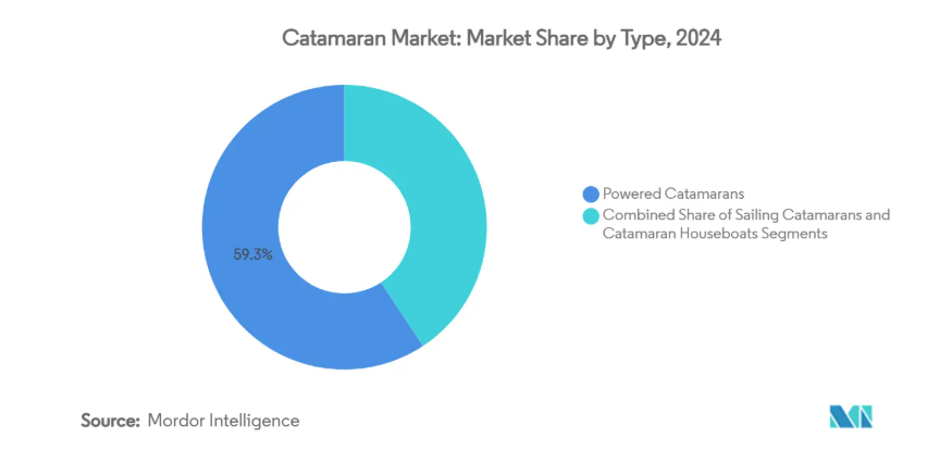 2024年、動力式船舶は総収益の59.30%を占めました。これは、趣味の船長がジョイスティック操作、簡素化されたドッキング、効率的な空間レイアウトを好む傾向に後押しされたものです。チャーター会社が顧客の快適性期待に応えるため船隊を更新する中、動力式カタマランの市場規模は着実な成長が見込まれます。ハウスボートカタマランは8.07%のCAGR(年平均成長率)を誇り、特に内陸水路や島嶼リゾートにおける代替宿泊施設トレンドの波に乗っています。一方、セーリングモデルはニッチな需要に対応し、運用コスト削減を優先する性能重視の所有者に訴求しています。