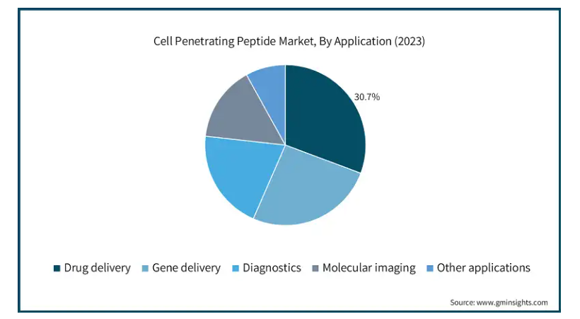 細胞透過性ペプチド市場は、用途に基づき、薬物送達、遺伝子送達、診断、分子イメージング、その他の用途に区分されます。2023年の市場シェアは薬物送達分野が30.7%で圧倒。