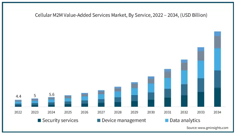 より高速で信頼性の高いネットワークの出現は、IoTエコシステムにとって不可欠です。さらに、5Gネットワークの拡大は、セルラーM2M付加価値サービス市場の成長を支援します。2025年第1四半期現在、世界全体の流通総額は約20億件に達しており、この数字は5Gのカバレッジ向上により増加すると予測されています。医療、製造、自動車、スマートシティなどの産業分野では、5g技術は、待ち時間の短縮、帯域幅の拡大、低遅延など、幅広い機能を備えているため、複雑なデータを必要とするアプリケーションを実現する重要な手段となっています。セルラーベースのIoT装置の台頭により、遠隔装置管理、データ分析、リアルタイムモニタリング、ネットワーク最適化は、このような装置の可能性を最大限に引き出すために不可欠となっており、これらのネットワーク機能は高い需要があります。