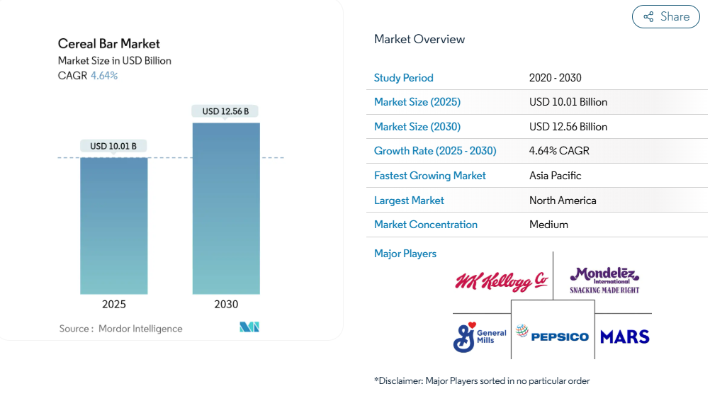 現代のライフスタイルにより、シリアルバーは時折の楽しみではなく、日常の必須栄養源へと変化しています。都市部のプロフェッショナルやフィットネス愛好家が、従来の食事準備から手軽な栄養補給オプションへ積極的に移行する「スナック化」の潮流が、この変革を加速させています。消費者はシリアルバーを、健康とウェルネス目標に沿った便利で機能的な食事代替品として捉える傾向が強まっています。2024年IFIC食品健康レポートによれば、アメリカ人の74%が毎日間食をしており[1]、タンパク質や食物繊維などの追加栄養効果を求める需要が高まっているため、シリアルバーは健康志向の間食として人気を集めています。メーカー各社は、栄養密度を高め、消費者の進化するニーズに応える機能性効果を提供するため、製品の再設計を通じて積極的な改良を進めています。この変化は、企業が味や価格のみでの競争から、健康志向のイノベーションに焦点を移すことで、市場における競争の在り方を再定義しつつあります。