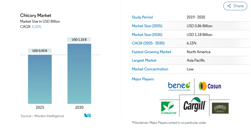 チコリ市場は、複数のグローバルおよび地域プレイヤーが存在するため、細分化され競争が激化しています。チコリ市場で事業を展開する主要メーカーには、ベネオGmbH、ロイヤル・コスーン、カーギル・インコーポレイテッド、コスクラ・グループ・ワルコワンSA、スターウェスト・ボタニカルズ社などが挙げられます。これらの主要プレイヤーは、製品ポートフォリオの多様化と市場成長のさらなる促進を目的として、研究開発(R&D)に多額の投資を行っています。新製品の発売、契約締結、合併・買収、投資拡大、提携といった産業の大きな変化に対応し、市場参加者は自らの存在感を強化するため、様々な戦略的取り組みを積極的に推進しております。