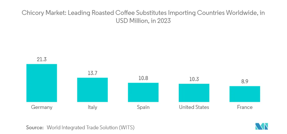 さらに、焙煎コーヒー代替品の人気急上昇が、食品・飲料分野におけるチコリ市場を後押ししています。カフェインを含まないコーヒー代替品を求める消費者の間で、焙煎チコリは風味豊かな選択肢として注目されています。イヌリン含有量により消化器の健康と総合的なウェルネスをサポートする点が特長です。さらに、コーヒー価格の上昇を背景に、コスト削減を目指すメーカーにとって、チコリはコーヒーに比べ費用対効果に優れる代替原料として最適です。この経済的優位性は、コーヒーメーカーが自社製品にチコリを配合する動機となるだけでなく、市場での存在感を高める要因にもなっています。加えて、カフェインフリーで健康志向の飲料に対する需要の高まりを受け、多くの国々がチコリを含む焙煎コーヒー代替品の輸入を拡大しています。例えば、World Integrated Trade Solutionのデータによれば、2023年にはドイツがチコリを含む焙煎コーヒー代替品を2,130万米ドル相当輸入し、輸入額で首位となりました。次いでイタリアが1,370万米ドル相当を輸入しています。