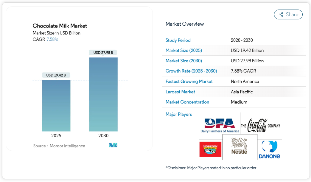 世界のチョコレートミルク市場は2025年に194億2000万米ドル規模であり、2030年までに279億8000万米ドルに達すると予測され、年平均成長率(CAGR)7.58%で拡大しています。かつては子供向けのおやつと見なされていたチョコレートミルクですが、現在では特に運動後の回復飲料として、大人の間で人気が高まっています。