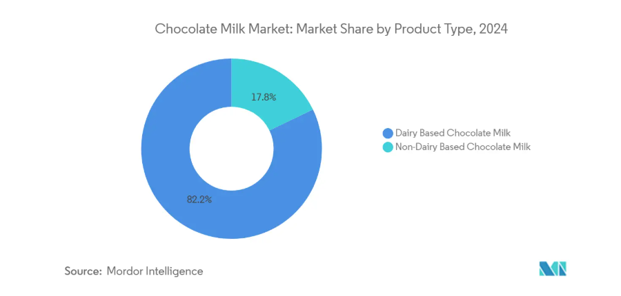 2024年現在、乳製品ベースの製品がチョコレートミルク市場を支配し、82.17%のシェアを占めています。このセグメントは確立された供給網、コスト効率、消費者との強い結びつきという強みを保持しています。トゥルー・ムー・チョコレートミルクのようなブランドは、本物の牛乳と天然香料に重点を置き、味と栄養の両方を重視する家族層に対応しています。一方、シャムロック・ファームズ・チョコレートミルクは、クラシックな味わいと栄養豊富なプロファイルを謳い、子供から大人まで幅広い層の支持を獲得しており、代替品が増加する中でも乳製品セグメントの強固さを示しています。