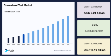世界のコレステロール検査市場は、高コレステロール値による心血管疾患の重要性への認識の高まり、生活習慣病の増加、検査技術の進歩により牽引されています。肥満率の増加が世界的な健康懸念を招き、早期診断の需要が増加しているため、市場は成長を続けています。