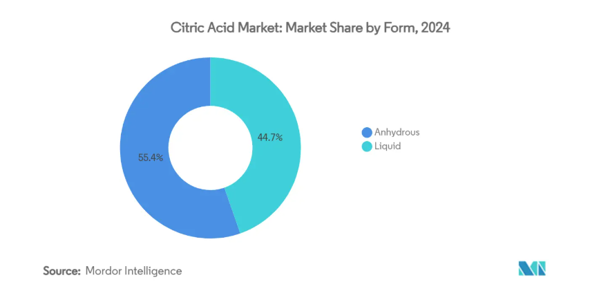製造プロセスの効率化やシステム統合の促進にも寄与しています。この傾向は飲料産業で特に顕著であり、液体クエン酸はシロップ調製工程にシームレスに統合され、粉末取り扱いに伴う汚染リスクを低減します。さらに、貯蔵・輸送技術の進歩により従来型の安定性懸念が緩和され、液体形態の実用性がさらに向上しています。こうした改善により、従来は無水タイプが主流だった用途でも液体クエン酸の採用が拡大しており、予測期間における持続的な成長が見込まれます。