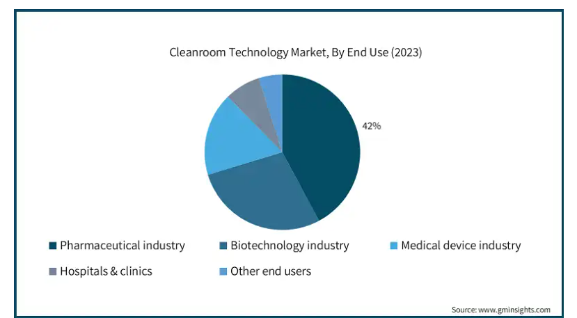 エンドユーザー別では、クリーンルーム技術市場は製薬産業、バイオテクノロジー産業、医療装置産業、病院・診療所、その他のエンドユーザーに分類されます。製薬産業セグメントは2023年の売上高シェア42.2%で市場を支配。