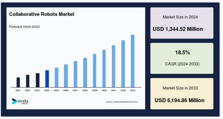 協働ロボット(コボット)は、共有スペースや人とロボットが近くにいる場所で、人とロボットが直接相互作用するように設計されている。 人とロボットが離れている従来の産業用ロボットに比べ、コボット・アプリケーションは対照的である。 いくつかのアプリケーションでは、いくつかの技術的進歩により、産業用ロボットよりも協働ロボットの方が優れている。 協働ロボットの需要は、柔軟性、生産性、安全性により高まっている。 今後数年間は需要が大幅に増加し、今後10年間は安定した成長が見込まれる。