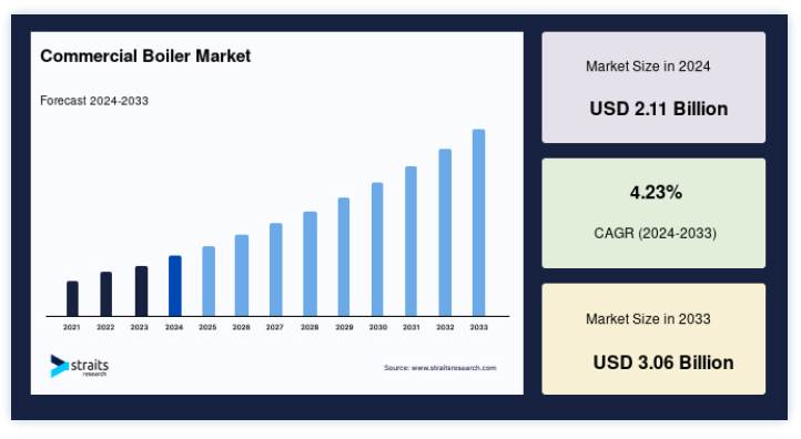 世界の業務用ボイラー市場は、2024年に21.1億米ドルの収益シェアを持ち、2025年の22.0億米ドルから 2033年には30.6億米ドルに達すると予測され、予測期間中(2025~2033年)に CAGR 4.23%で拡大する。