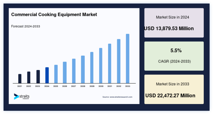 世界の業務用調理機器市場規模は、2024年には138億7,953万米ドルと評価され、2025年には146億4,291万米ドル、2033年には224億7,227万米ドルに達すると予測されており、予測期間(2025年~2033年)中のCAGRは5.5%で成長すると見込まれています。